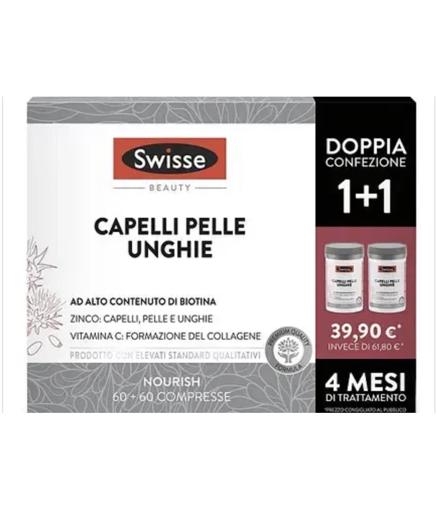 Swisse Capelli Pelle Unghie, integratore per il benessere di capelli, pelle e unghie grazie a biotina, zinco e vitamina C. Format: bipack da 60+60 compresse.